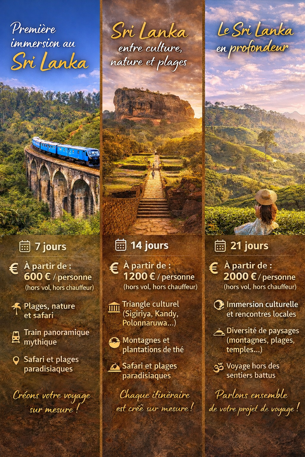 L'étape suivante est simple : contactez-nous. Que ce soit pour un devis personnalisé ou pour discuter de vos envies, nous sommes là pour concrétiser votre voyage de rêve au Sri Lanka.